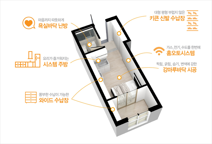 | 욕실 | 욕실바닥 난방시스템, 고급비데, 고급 세면대, 풍부한 수납장, 청소용 노즐 등 |